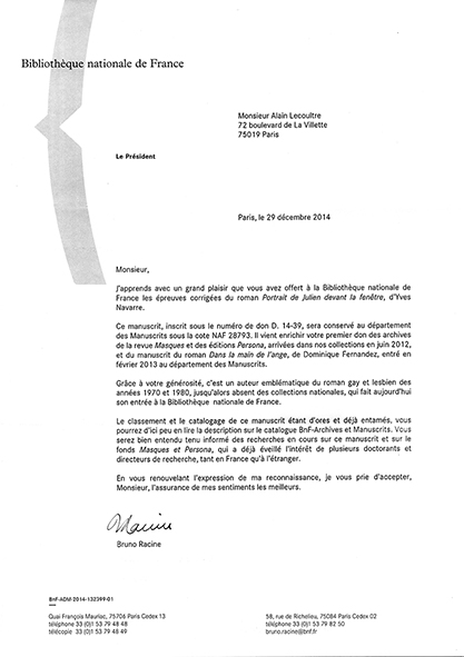 *Août 2014 : Découverte dans la résidence de vacances, de nouvelles archives dont le manuscrit dactylographié de Portrait de Julien devant la fenêtre d’Yves Navarre, dédicacé à Jean Pierre Joecker, Ainsi que de nombreux documents sur |