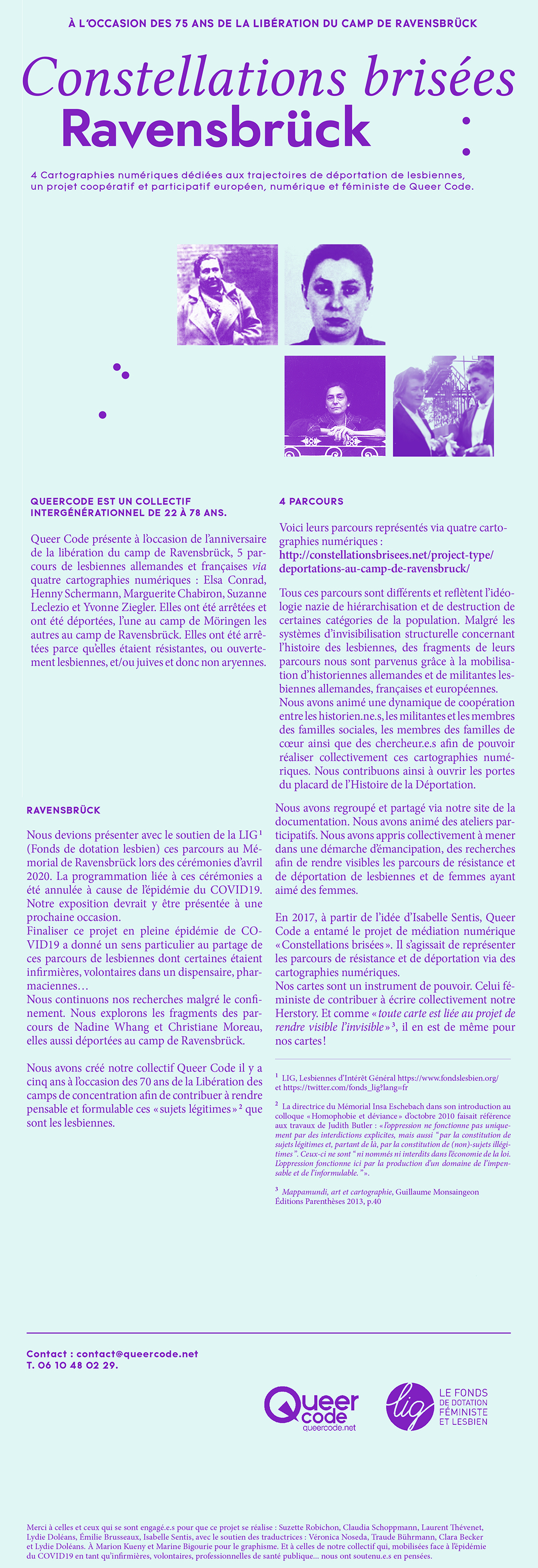 *Avril : * 21 Avril : Déportations au camp de Ravensbrück – Constellations Brisées. Nous devions, Isabelle Sentis et moi être le week-end dernier au Mémorial de Ravensbrück, à l’occasion du 75ème anniversaire de la libération de ce camp, pour présenter notre expo "Constellations brisées, Ravensbrück" à l'occasion des 75 ans de la Libération de ce camp de concentration. Il s ’agit d ’une expo multimédia présentant cinq parcours de lesbiennes allemandes et françaises, avec des beaux Qr code pointant vers des carto numériques. Ravensbruck_DDP_2004_FR mémoire des lesbiennes.