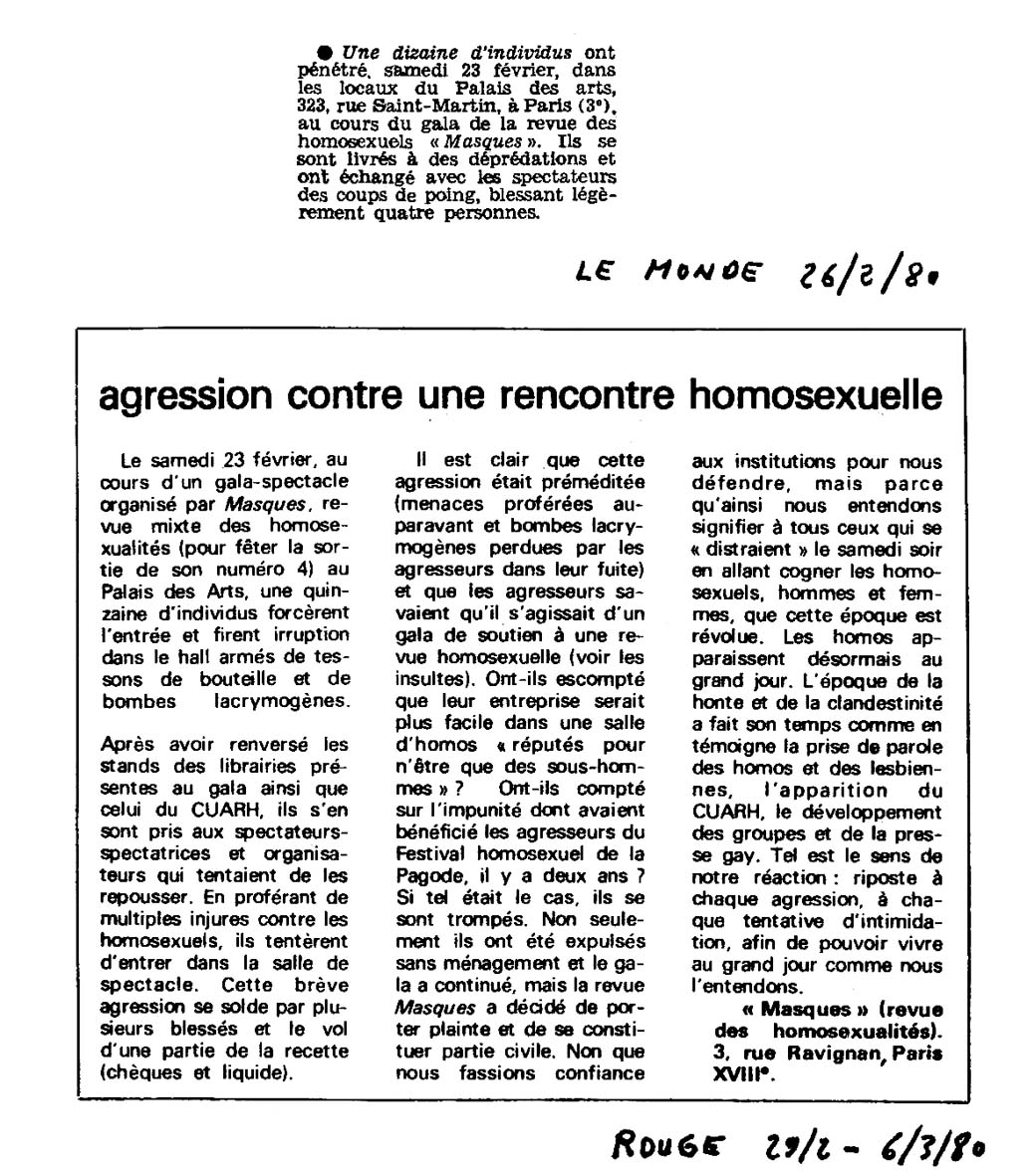 Le numéro 2 était encore très autocentré sur les préoccupations du groupe fondateur, comme en témoigne le Dossier «Identité », et victime sans doute de l’activisme déployé après la sortie du numéro1 : la diffusion était encore militante, un diffuseur professionnel « Alternative et parallèle » n’apparut qu’avec le N° 3. La revue n’avait ni locaux ni adresse propre : la librairie Anima, rue Ravignan, recevant le courrier jusqu’à l’ouverture d’une BP avec le numéro7 (hiver 80/81). Evidemment tous les collaborateurs étaient bénévoles, aucun article ou contribution ne fut rétribué, seuls les droits photographiques furent acquittés, les voyages jamais remboursés : malgré son succès, Masques ne réussit jamais à salarier un quelconque collaborateur. Une deuxième fête, au Palais des Arts, le 23 février 80 (avec Catherine Ribeiro, Marie-France, Les Pédalos et le film de Philippe Valois, Les Phalènes) bien que victime de l’attaque d’un commando d’extrême droite (?) fut de nouveau un succès et améliora, malgré le vol d’une partie de la recette, la trésorerie ! Cette grande pauvreté eut des conséquences fâcheuses : L’abondance de coquilles et erreurs diverses dans les textes, un grand nombre de lettres de lecteurs restaient sans réponse, certaines demandes d’abonnement sans suite etc.… La situation matérielle s’améliora toutefois avec la création de Persona en avril 1981: les membres salariés de l’entreprise travaillant également pour Masques qui bénéficia aussi de ses locaux. Enfin, en avril 1980, une délégation de Masques participe, à Barcelone, à la 2° conférence internationale de l’IGA ( International Gay Association). Masques, Gai-Pied et Ilia représentent la France au sein de l’association de la presse gaie internationale. En mai 1980, JP Joecker tente d’alerter l’opinion française sur le sort des homosexuels cubains, qualifiés par le régime de « gusanos » (vers de terre) et dont plusieurs milliers, réfugiés à Port Mariel, tentent de fuir la dictature castriste. Seul, Jean François Kahn acceptera de publier cette tribune libre dans Les Nouvelles littéraires… Quant au Cuarh, il refusa de s’engager ! Ce refus sera vigoureusement dénoncé dans une tribune signée par J M Combettes, J P Joecker et A Sanzio, publiée dans le N° 5 de Masques, à laquelle J Boyer répond dans un article intitulé « Que doit faire le Cuarh ? » Dans ce même numéro 5 A Sanzio dénonçait le silence complice sur la situation à Cuba. Enfin Masques (N°7 hiver80/81) signera et publiera