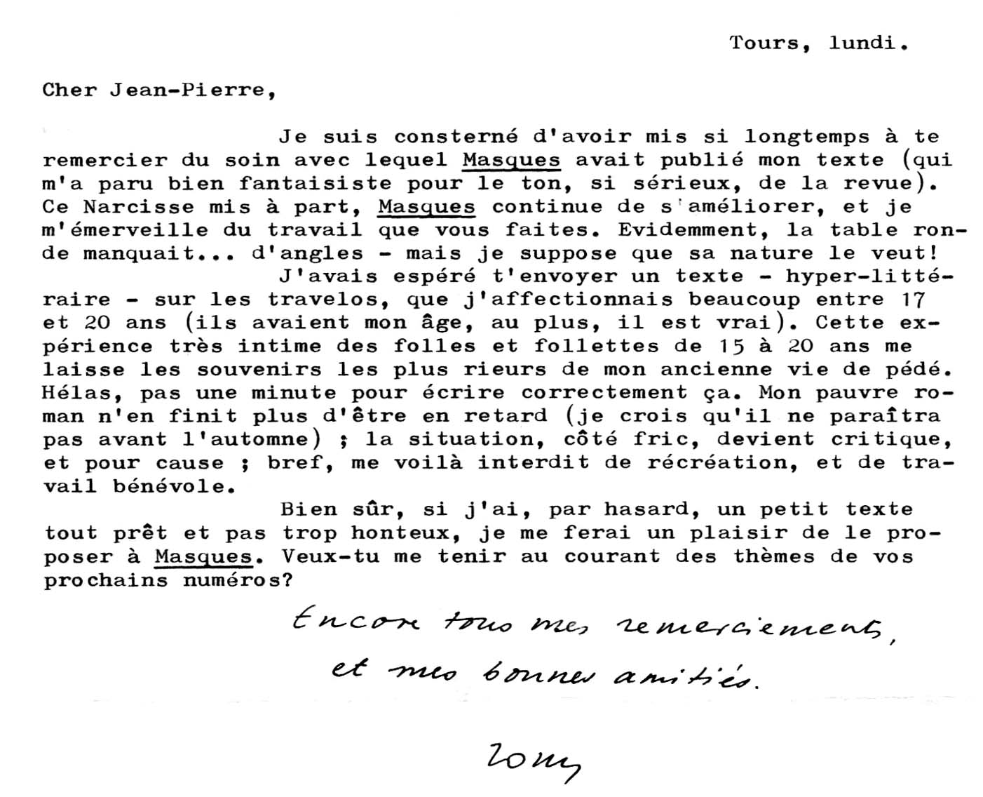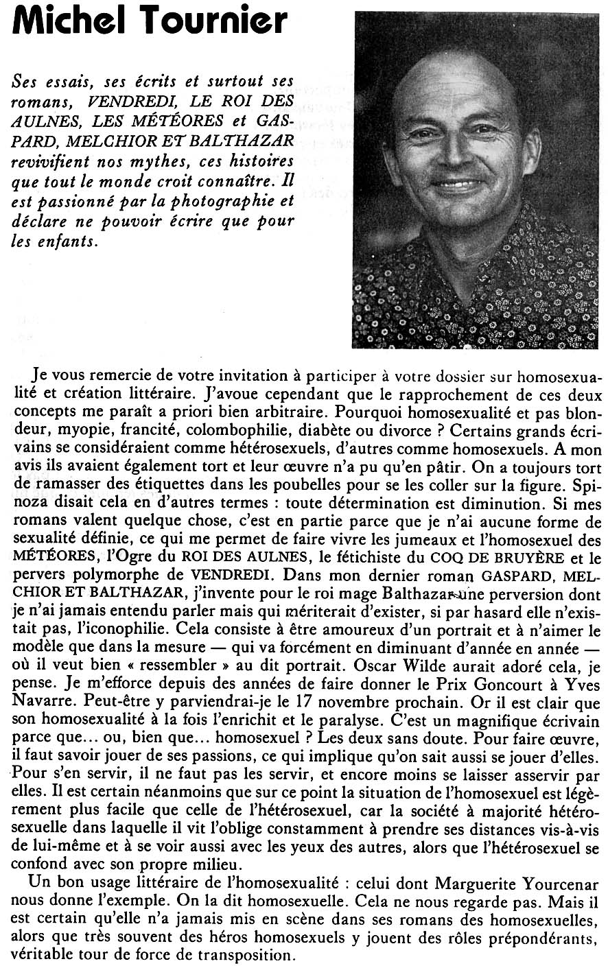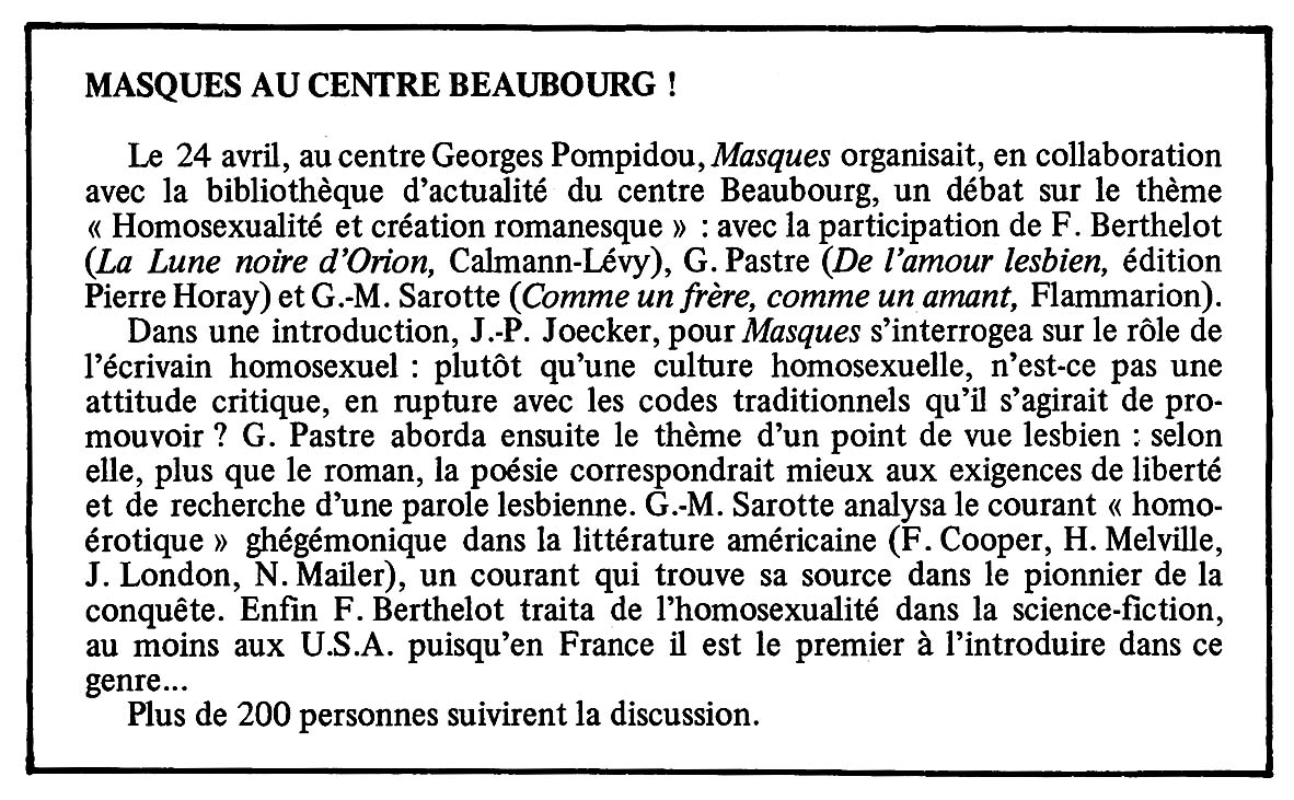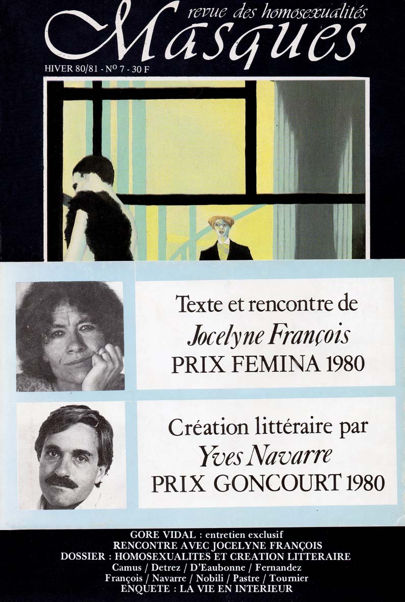 Nos deux amis venaient, à notre grande joie, d’être couronnés, et, coïncidence heureuse ou fruit de deux années de travail, le dossier central était consacré à «Homosexualités et création littéraire » avec les contributions de : Renaud Camus, Conrad Detrez, Françoise d’Eaubonne, Dominique Fernandez, Jocelyne François, Yves Navarre, Nella Nobili, Geneviève Pastre et Michel Tournier. Ce thème ayant fait l’objet d’un colloque au Centre Beaubourg le 24 avril 1980… Par ailleurs ce N°7 contenait un entretien avec Gore Vidal réalisé par Philippe Mikriammos. Les deux prix furent l’occasion d’une réception aux Mots à la bouche le dimanche 7 décembre… La librairie s’avéra bien trop petite pour accueillir les 300 personnes présentes ! Alors même qu’elle n’avait pas encore fêté son deuxième anniversaire, la revue Masques connaissait une éclatante réussite. Mais déjà d’autres défis se profilaient quelques mois avant une élection présidentielle qui paraissait bien mal engagée…