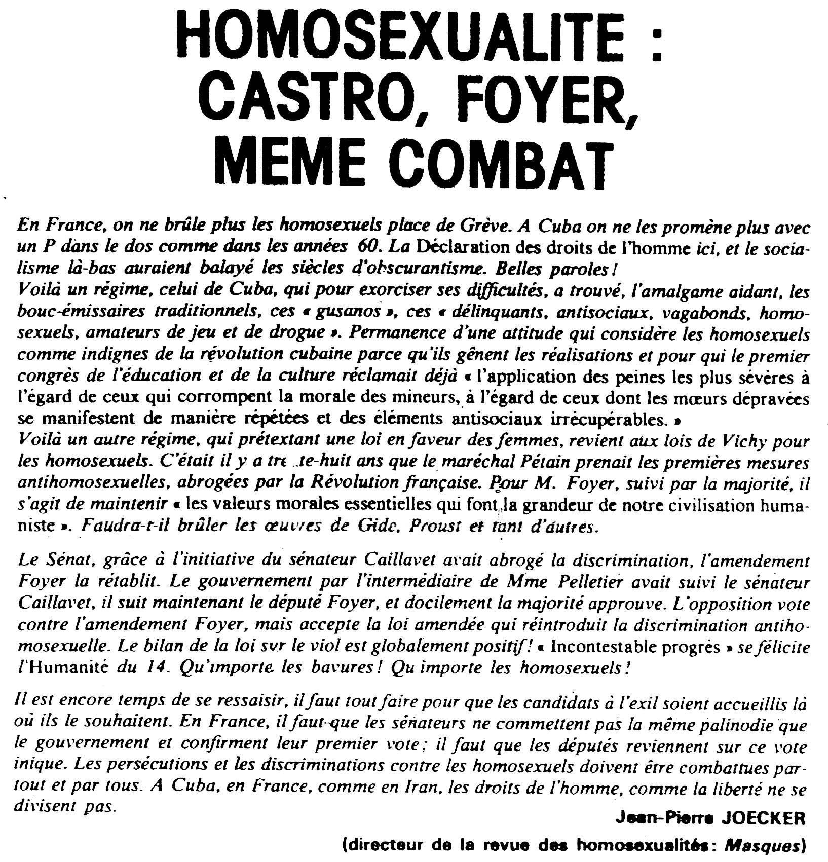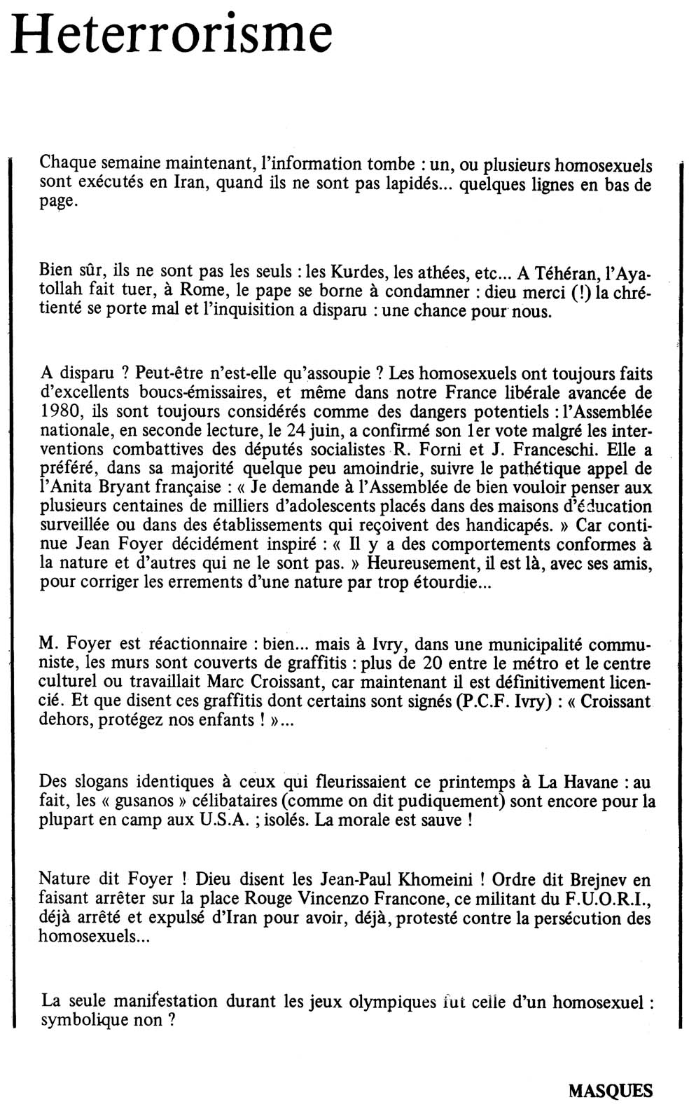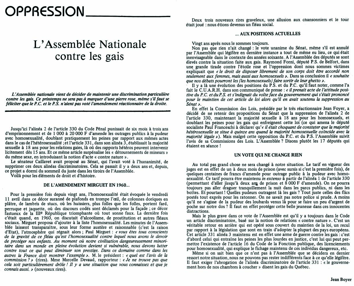 -Doc 12 : L’assemblée nationale contre les gais. Article de Jean Boyer -Masques N°5