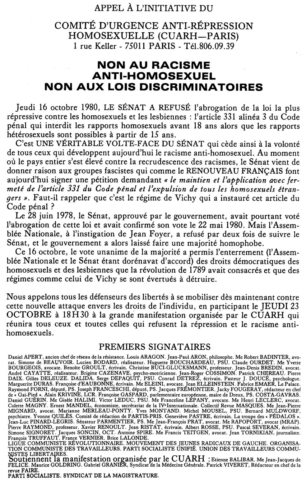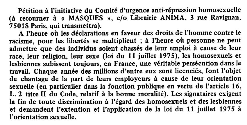 -Doc 13 : Pétition du Cuarh publiée dans Masques N°7 (hiver 80/81) contre les lois discriminatoires.