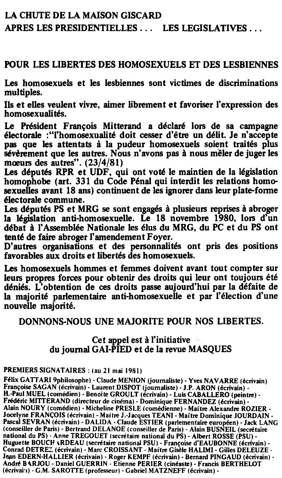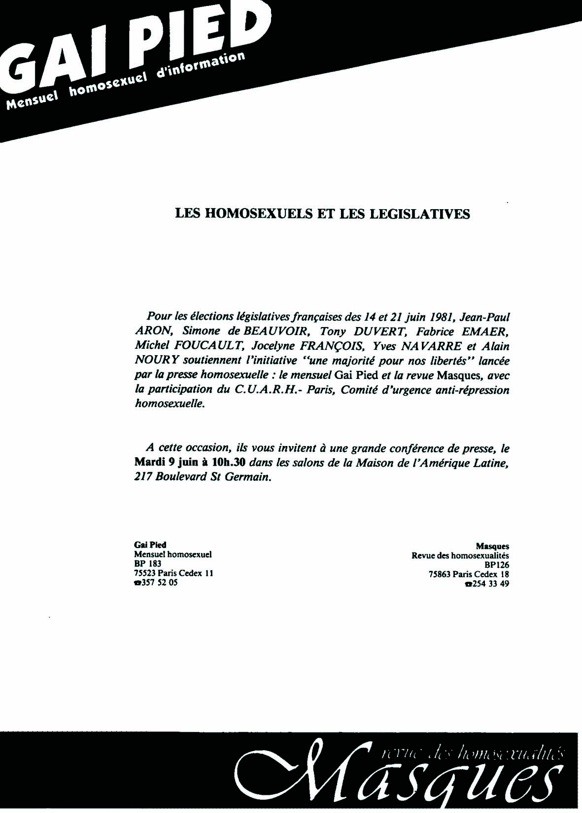 -Doc 16 : Appel de Gai Pied et Masques à une conférence de presse le 9 juin 81
