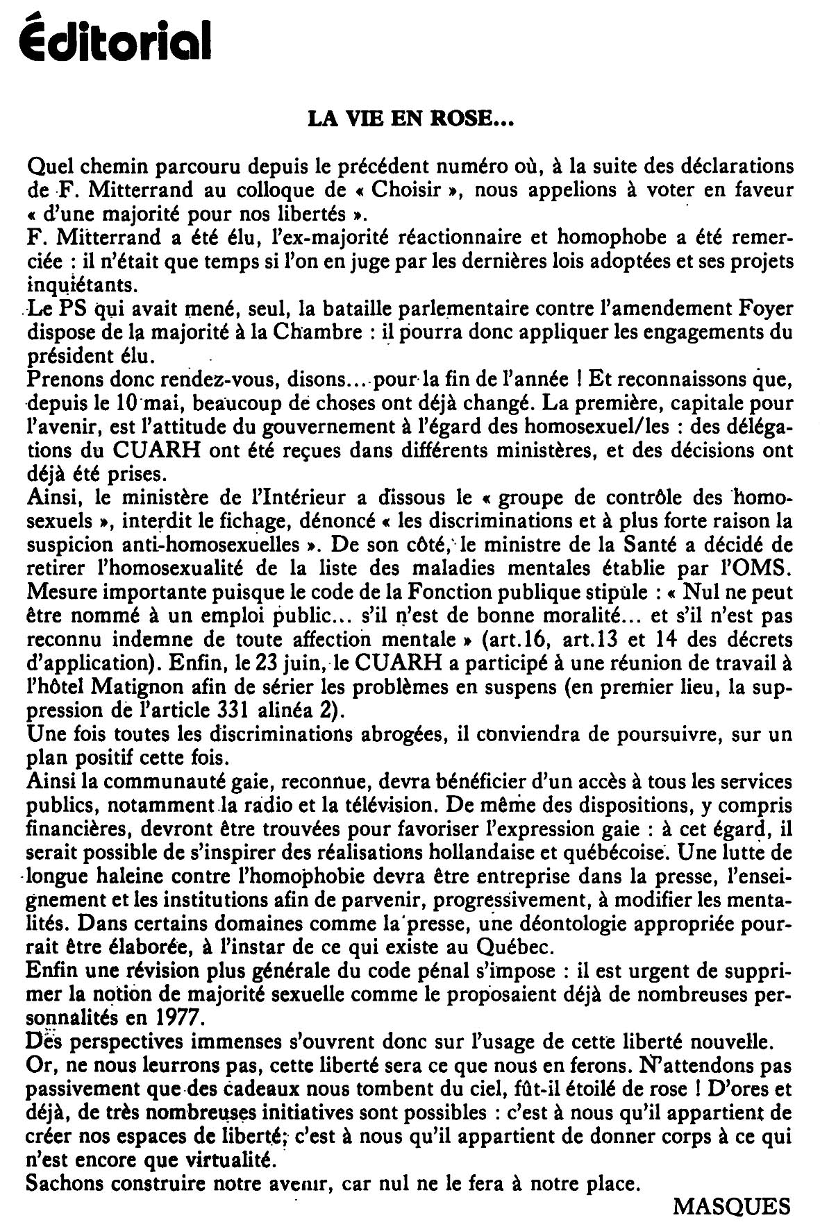 -Doc 18 : Editorial du N° 11 de Masques (automne 81) La vie en rose.