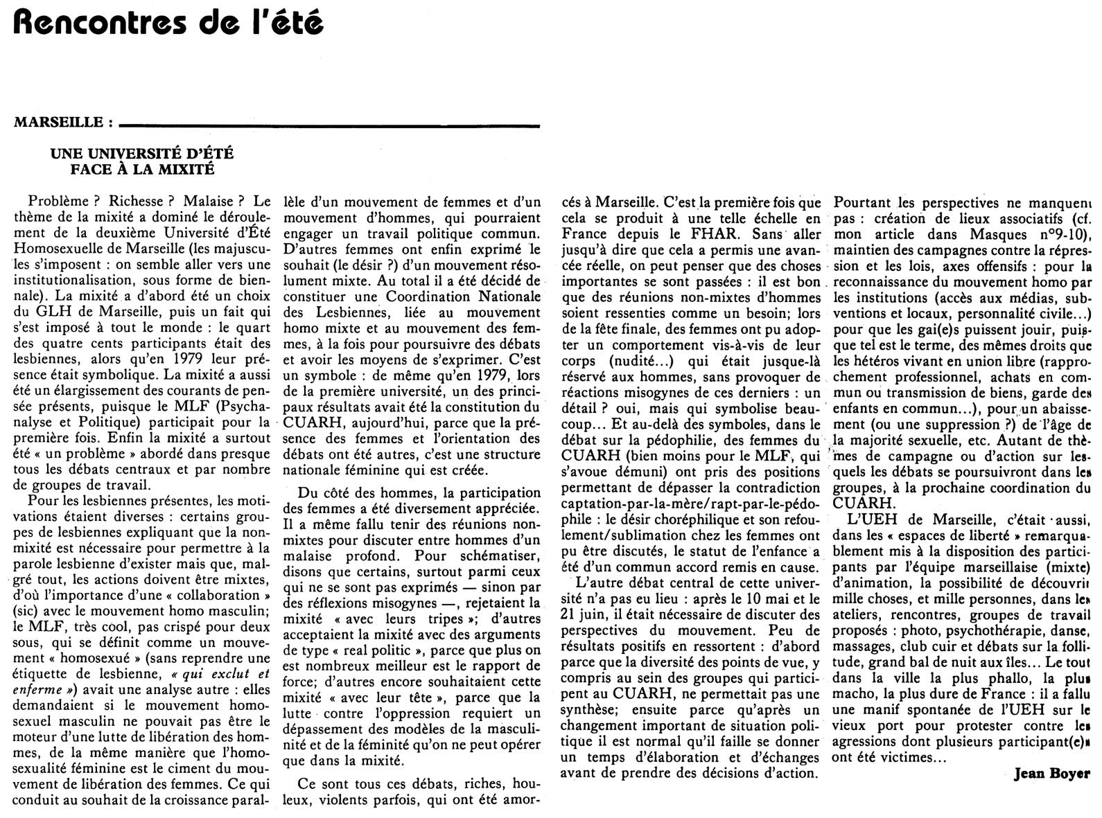 -Doc 19 : Article de Jean Boyer sur l’université d’été de Marseille. Masques N°11
