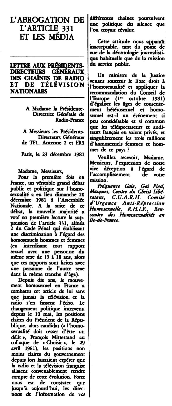 -Doc 22 : Lettre aux PDG des chaines de radio et télévision. (Masques N° 13 p 186)
