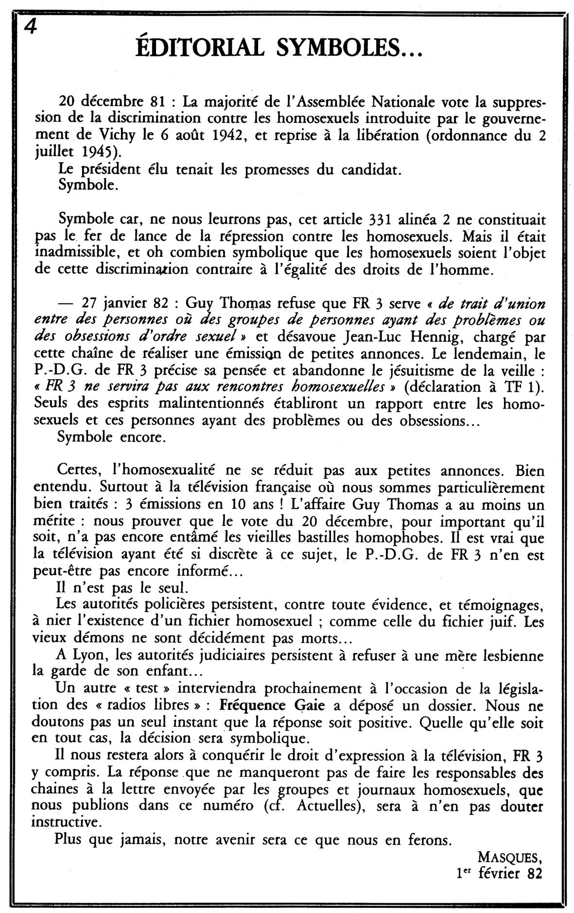 -Doc 23 : Editorial du N° 13 de Masques (printemps 1982) Symboles… (à propos de l’abrogation