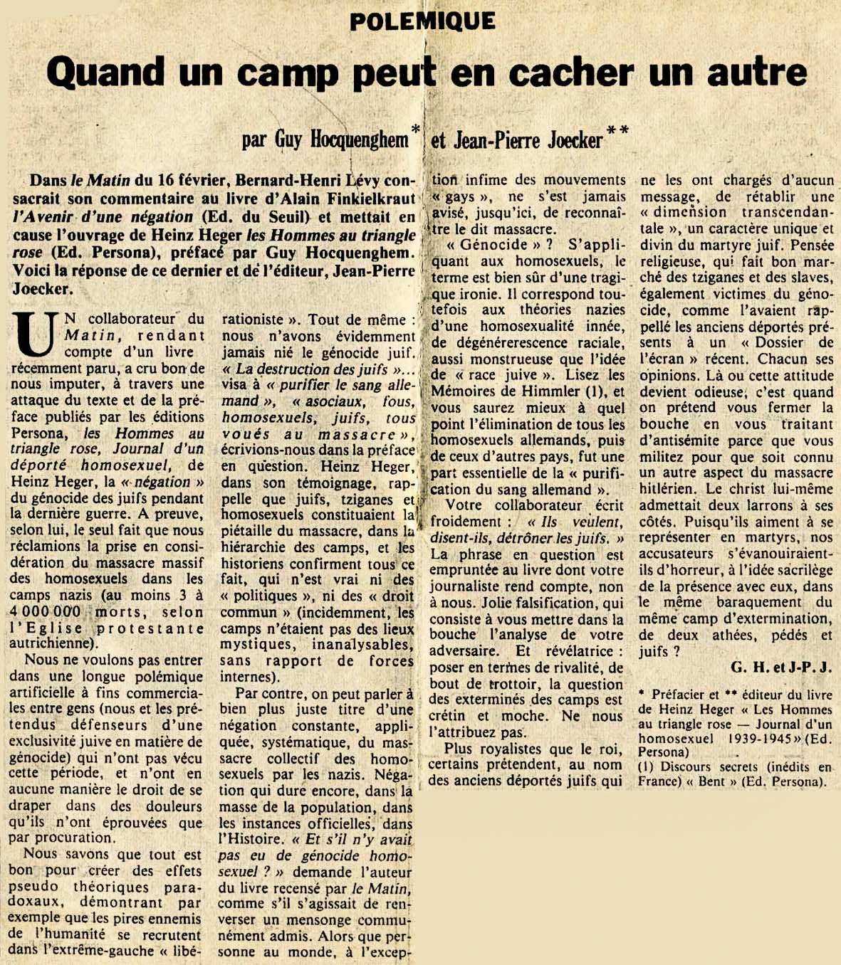 -Doc 24 : Article de JP Joecker et Guy Hocquenghem dans Le Matin (4 mars) sur les triangles roses