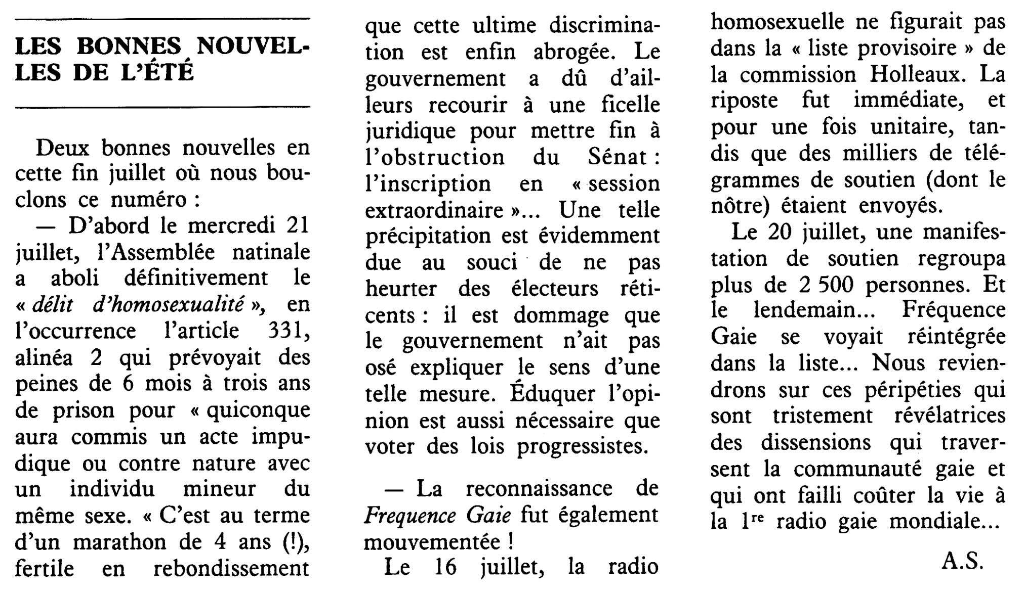 -Doc 28 : Les bonnes nouvelles de l’été. Article dans le N° 15 de Masques (automne 82)