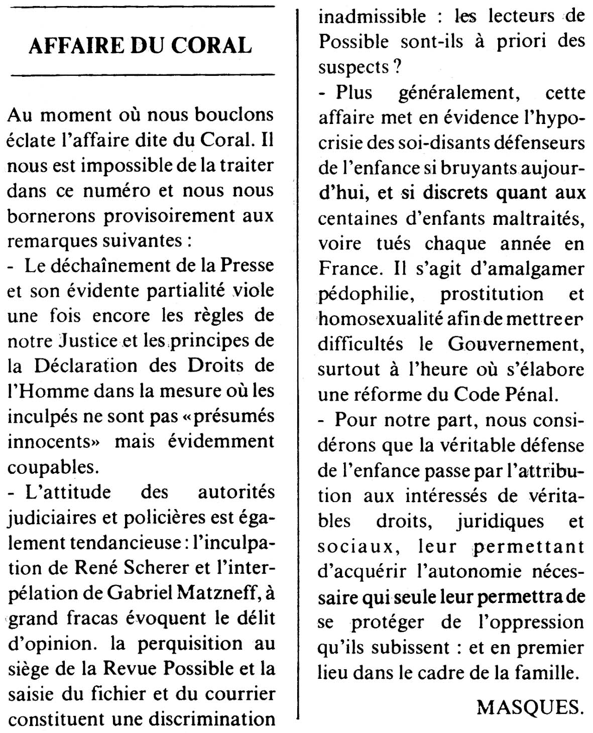 -Doc 30 : Masques et l’affaire dite du Coral. N° 16 (hiver 82/83) p 186