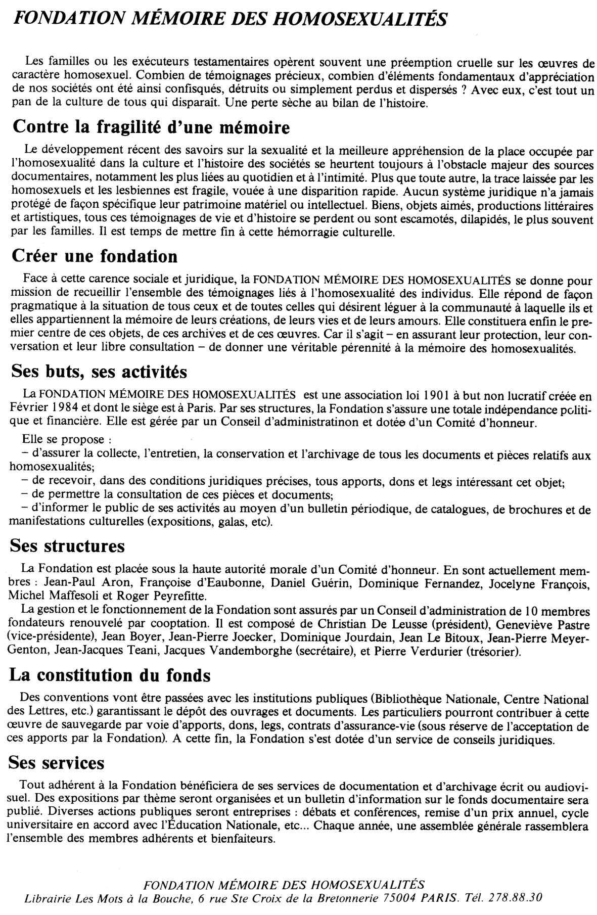 -Doc 36 : Création de la Fondation Mémoires des homosexualités. Masques N°22 p188