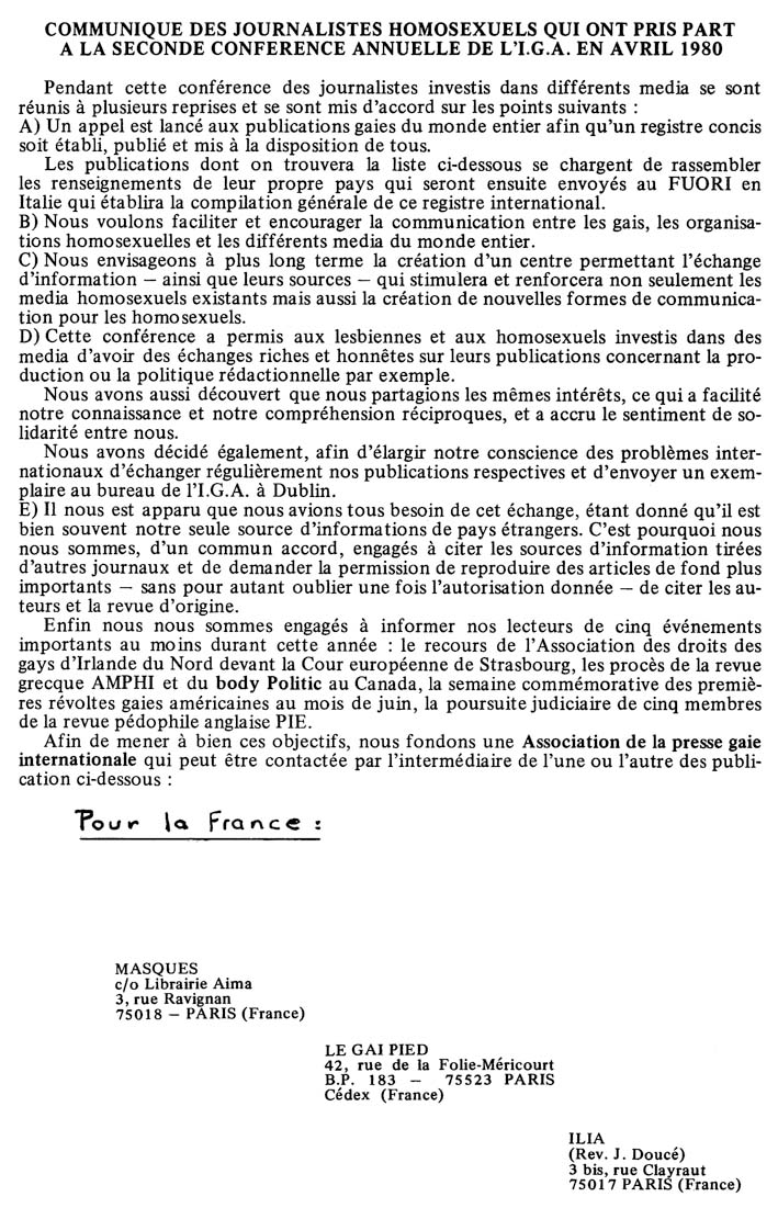 à Barcelone en avril 1980. Texte signé par les 3 journaux gais français. Dans Masques N°5 p 65