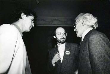 Jean Pierre Joecker et A Sanzio accueillent Roger Peyrefitte à la fête de Masques en février 1983