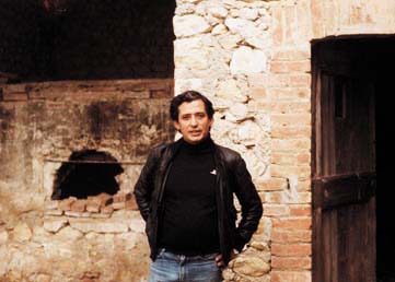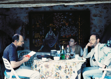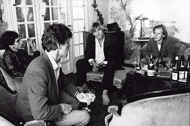 Gérard Depardieu reçoit Masques dans sa maison de Bougival le 8 octobre 1985. De G à D : P. Gautier, J P Joecker, G. Depardieu et Bertrand Mosca. (photo Pierre-Olivier Deschamps-Agence VU) |