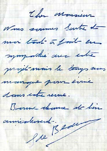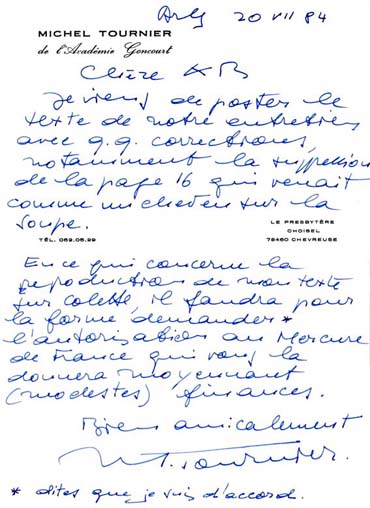 Lettre de Michel Tournier du 20 juillet 1984 |
