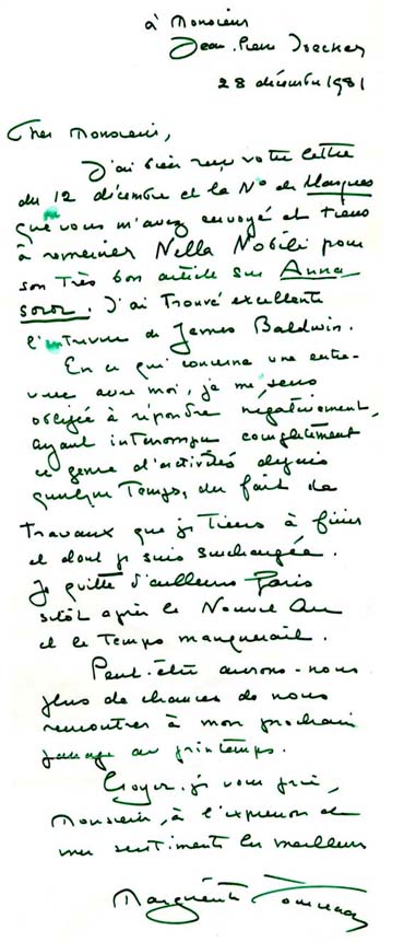 Lettre de Marguerite Yourcenar du 28 janvier 1981 |