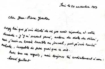 Lettre d’Hervé Guibert du 20 novembre 1983 |